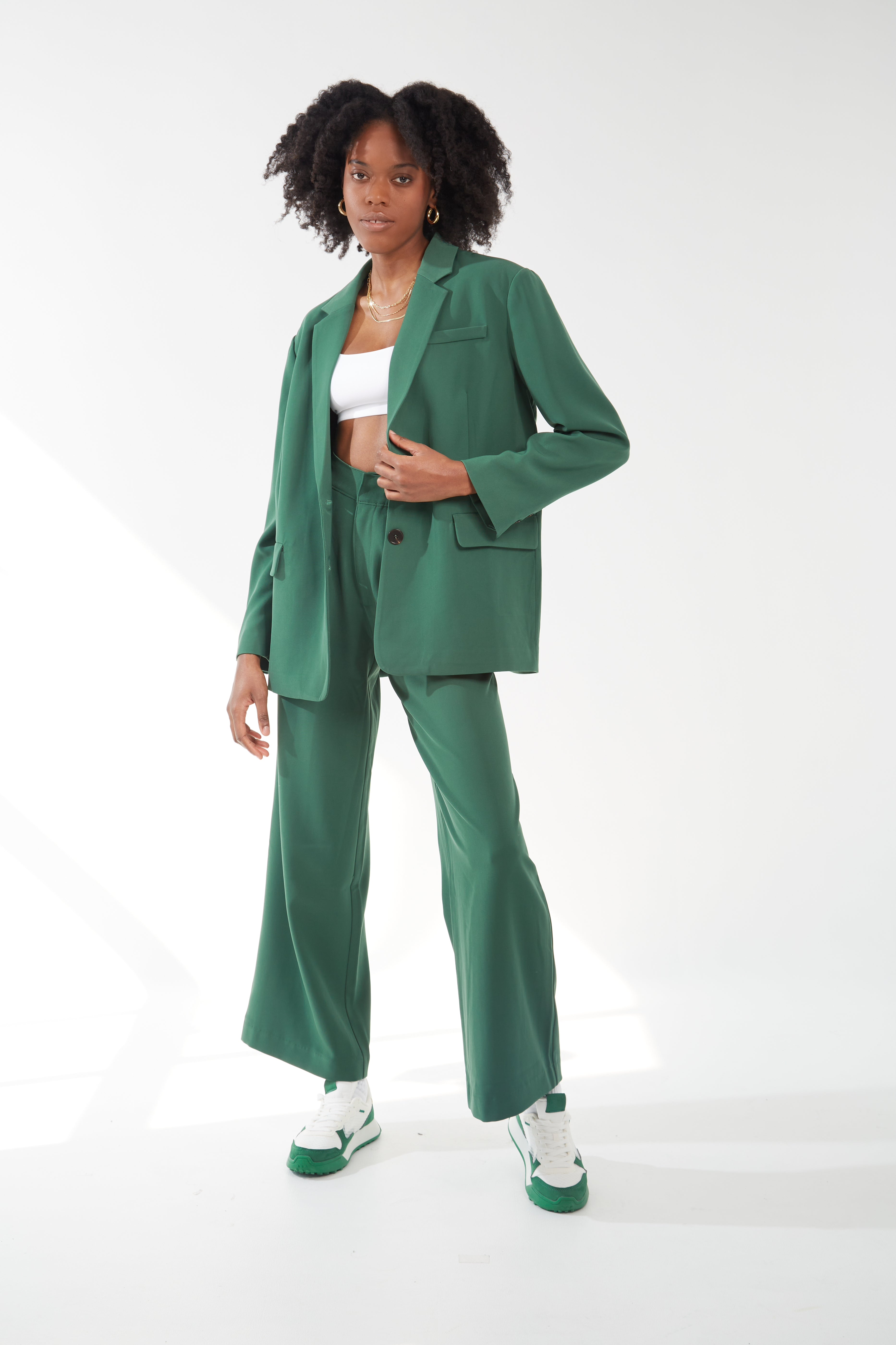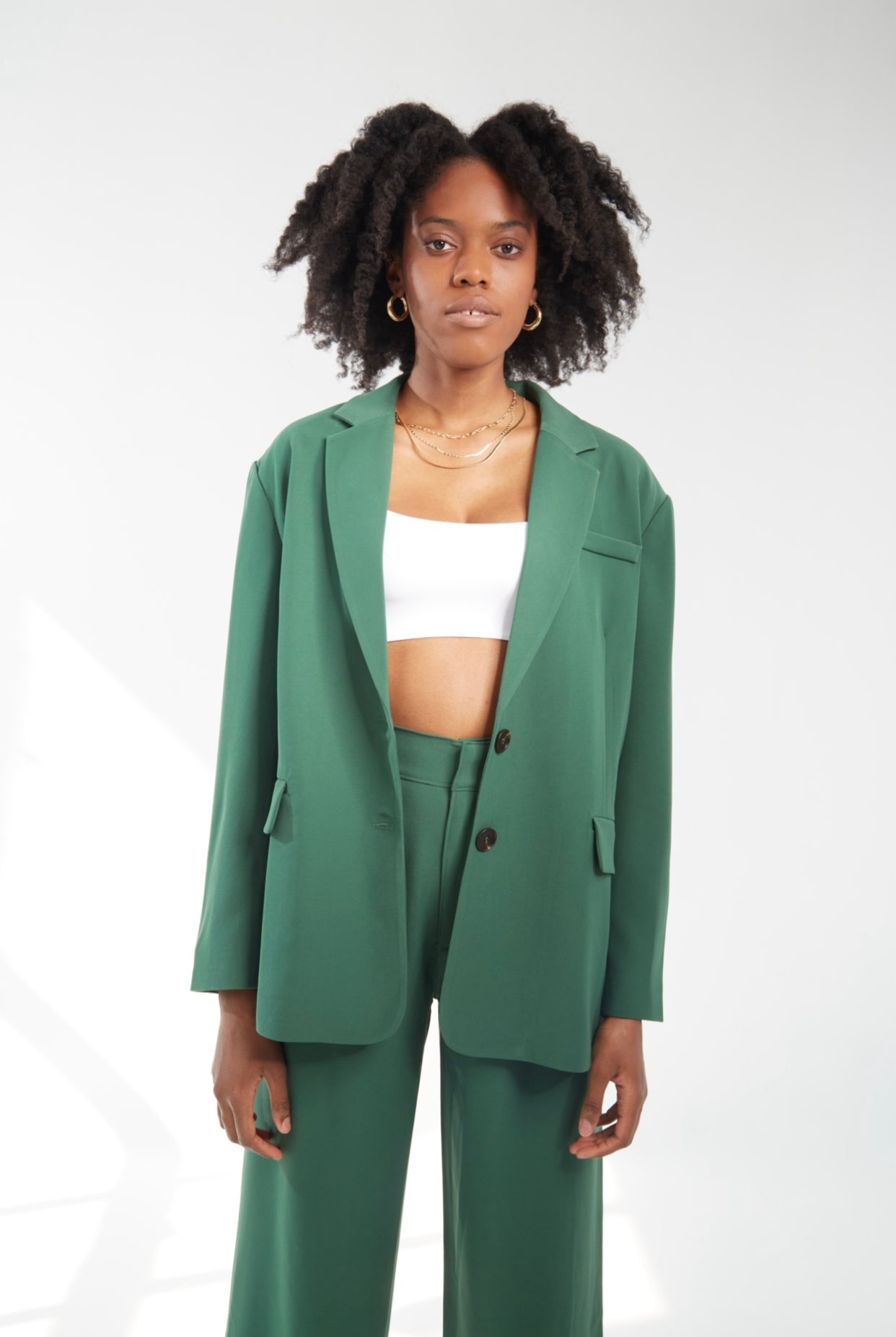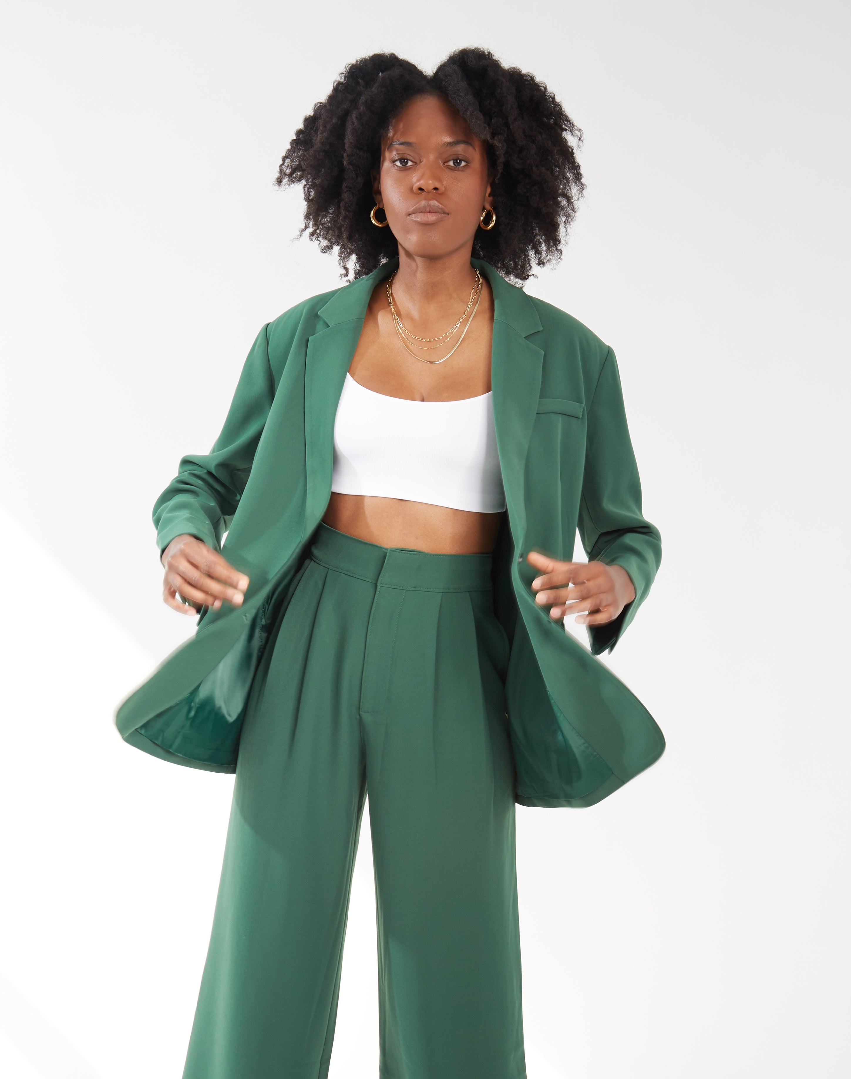 This oversized, single-breasted blazer is the perfect transitional piece that will complement any outfit ensemble. The gabardine fabric and clean finished interior add up to the elevated quality of this blazer. Pair the blazer with the matching Pleated Wide Leg Trousers for an effortless co-ord look.