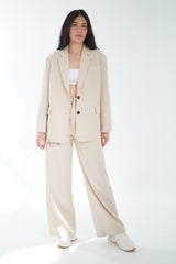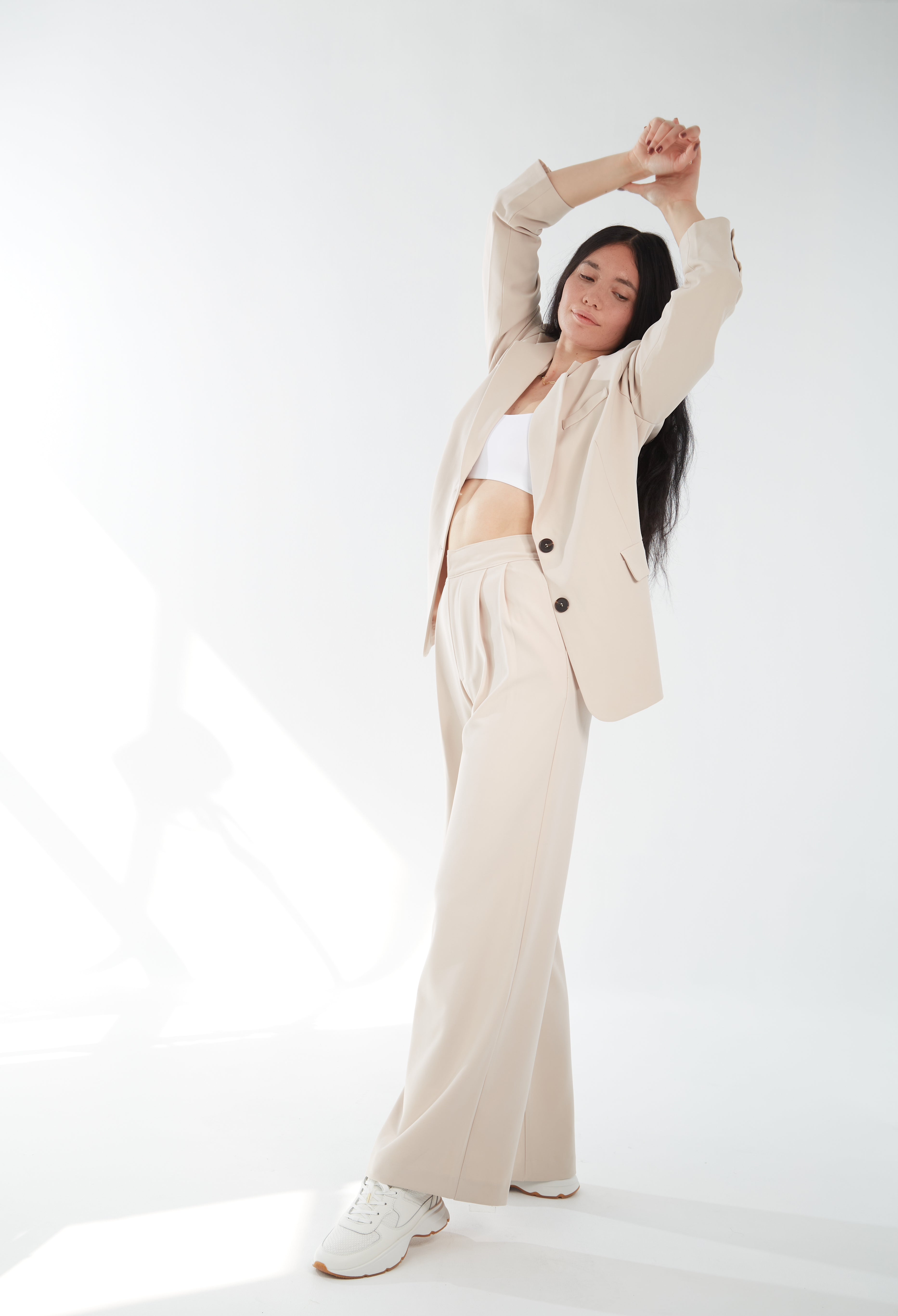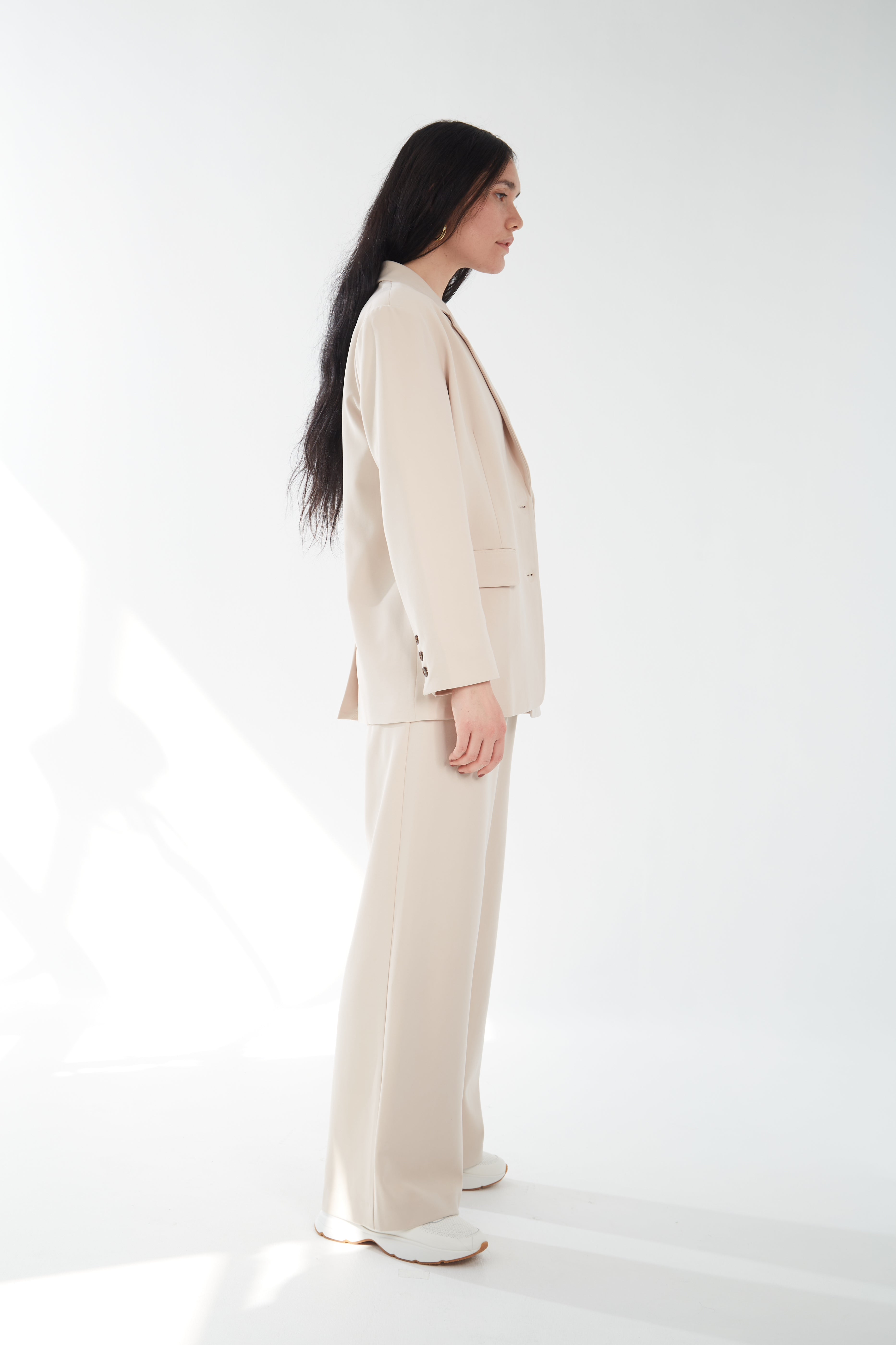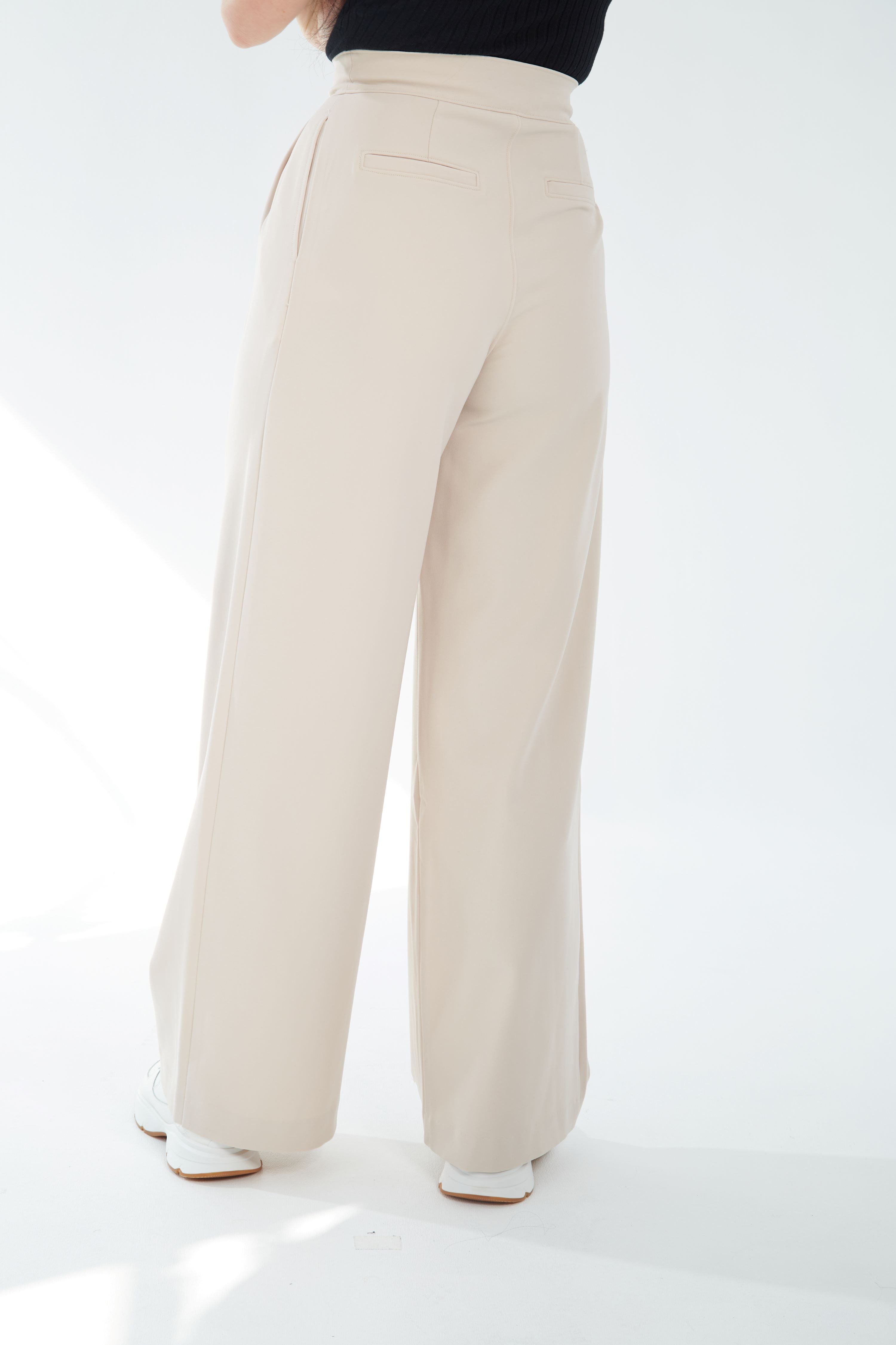 These are high-waisted, long, wide-leg trousers with front pleat detail. They are made with mid-weight, drapey gabardine fabric. Complete your look with the matching Oversized Structure Blazer.