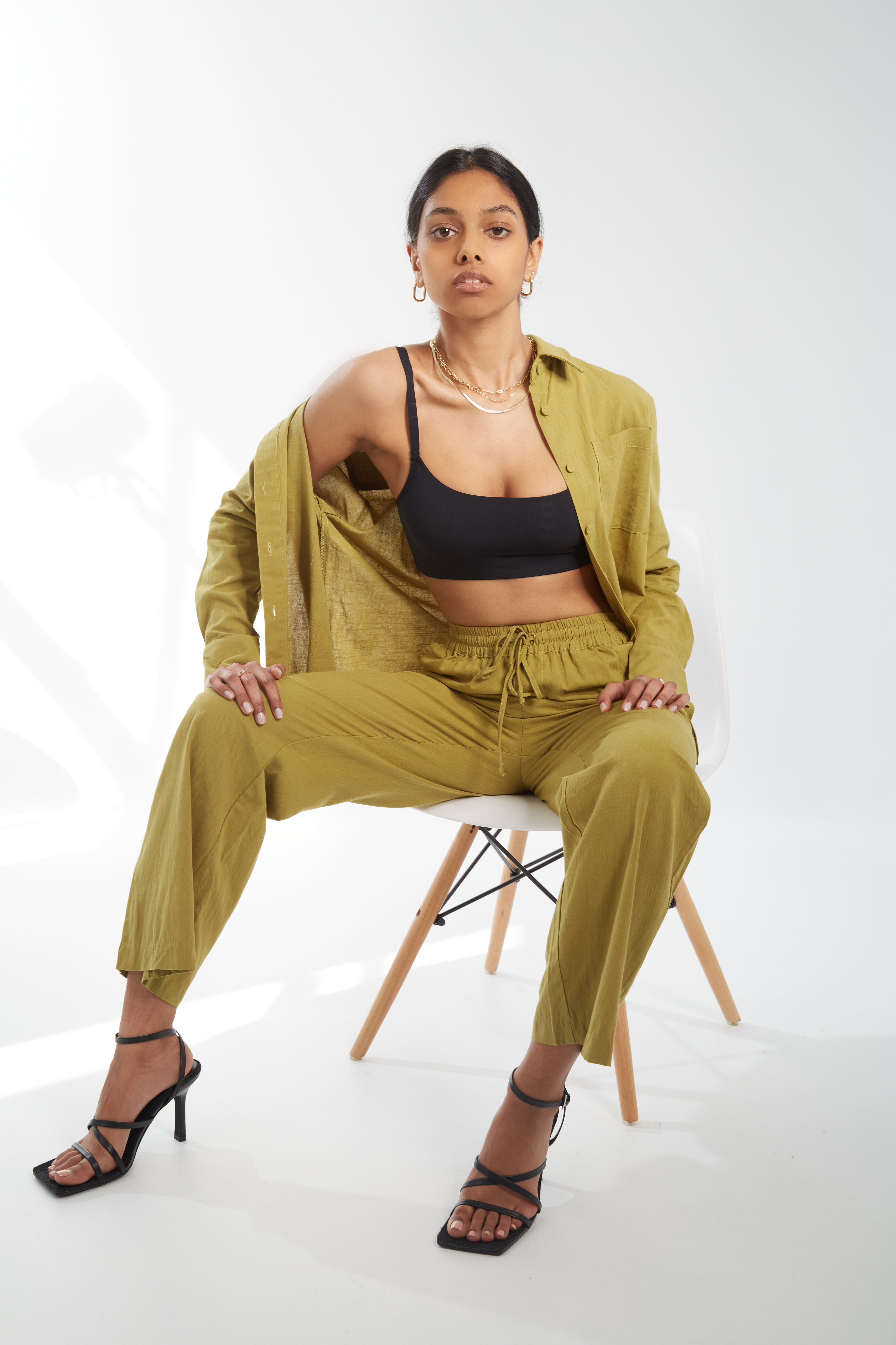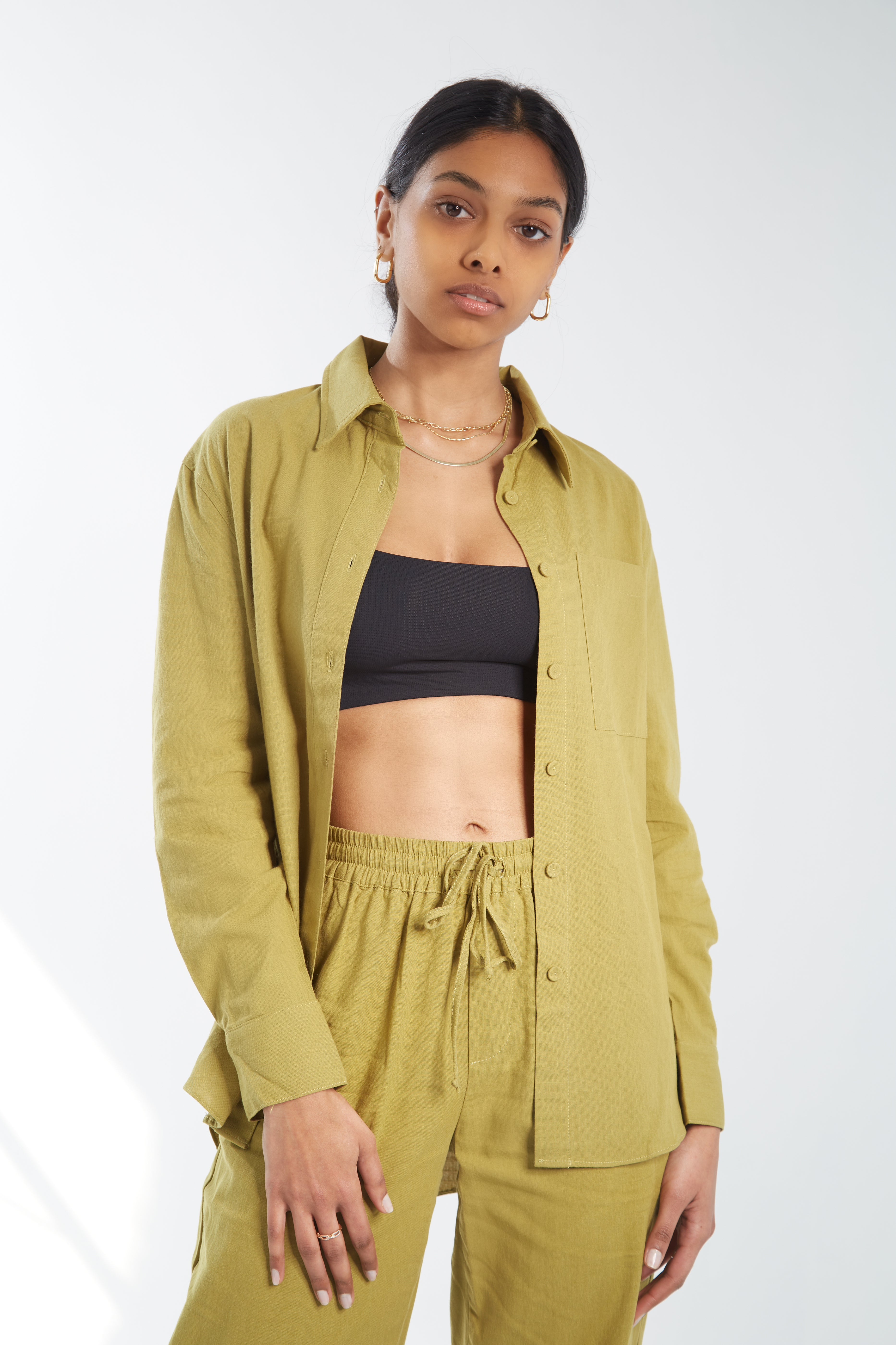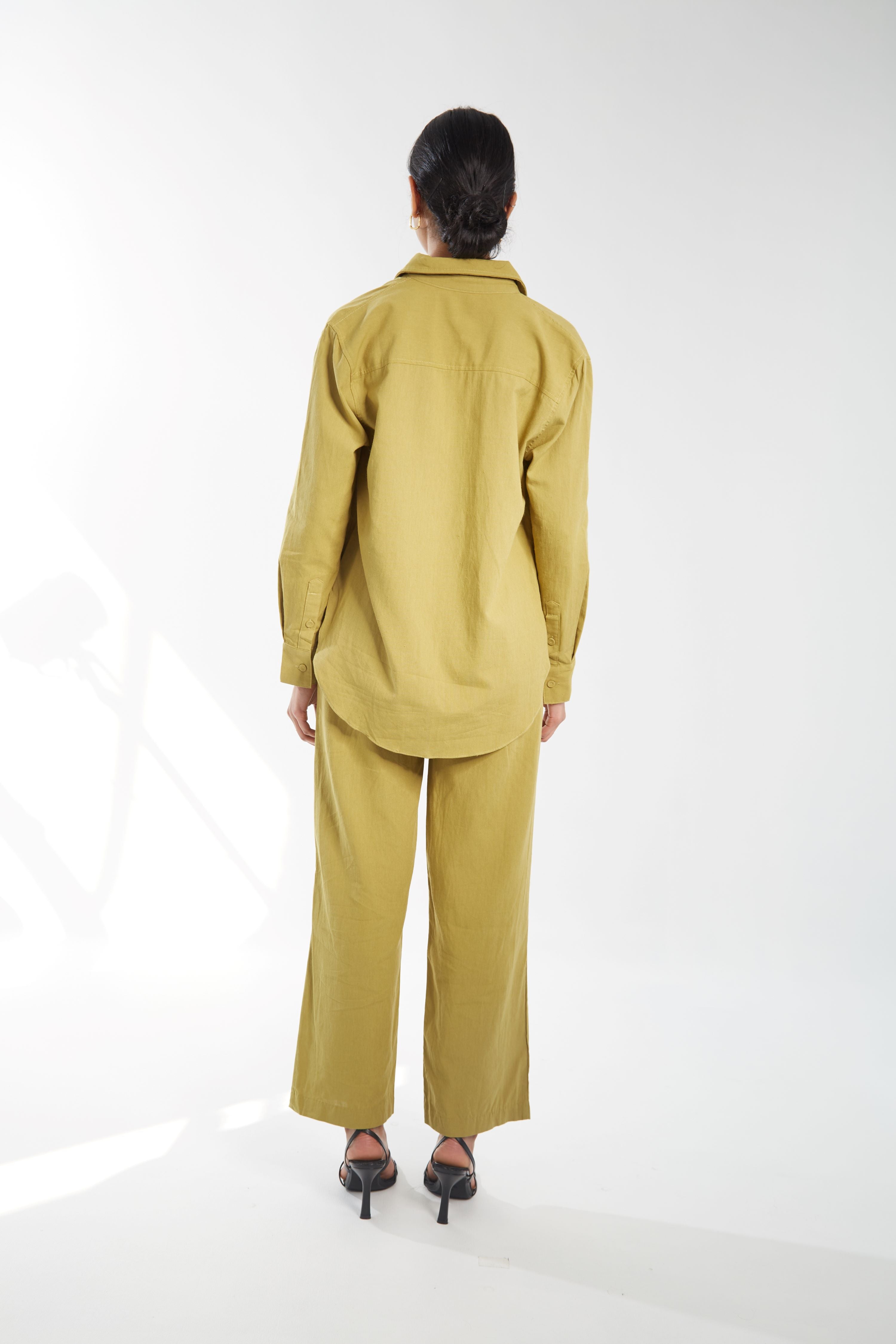 This two-piece set is made with a lightweight cotton/linen blend material in springy earth tones. This button-down placket shirt pairs perfectly with the matching straight-leg drawstring pants.