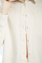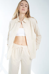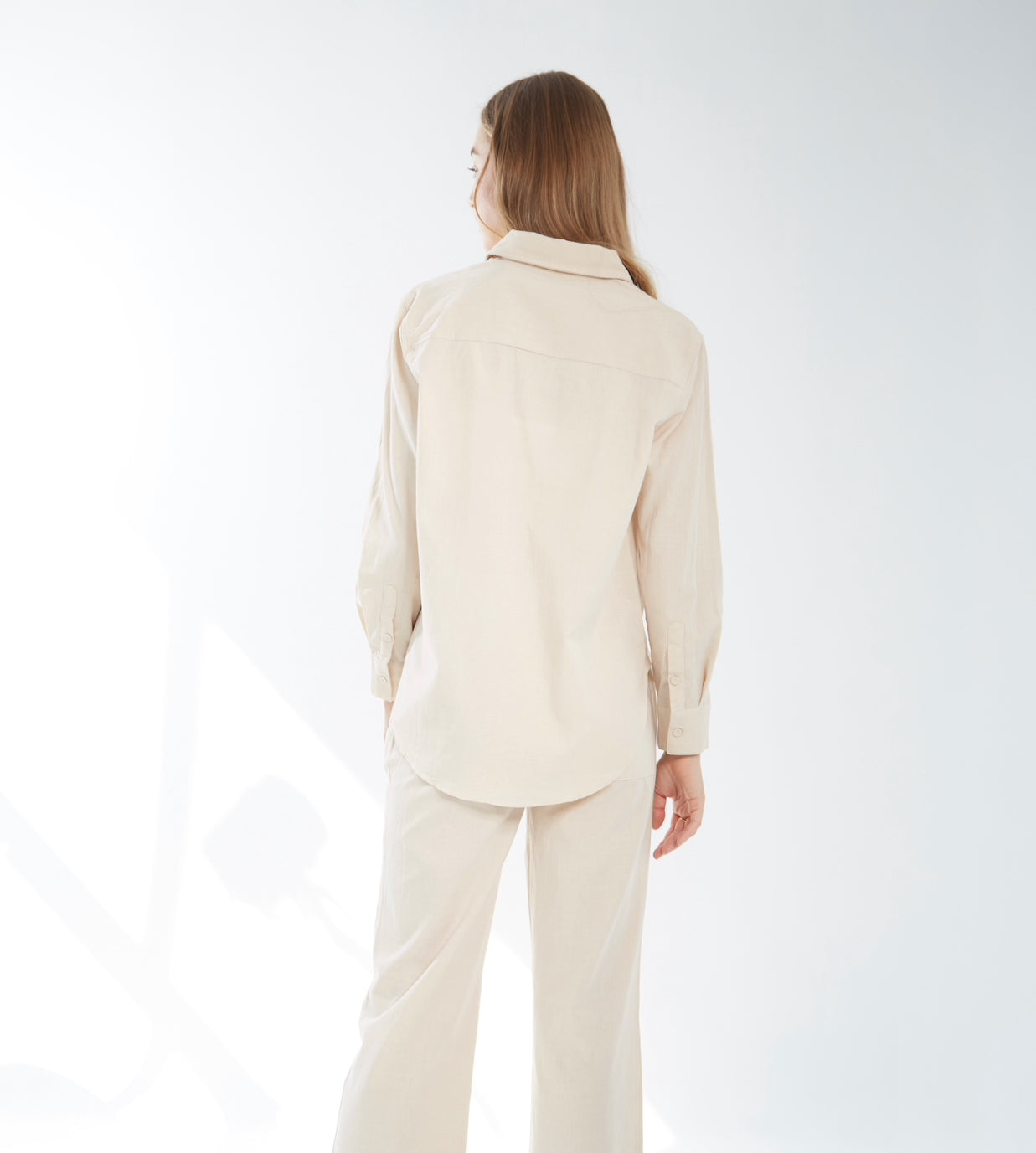 This two-piece set is made with a lightweight cotton/linen blend material in springy earth tones. This button-down placket shirt pairs perfectly with the matching straight-leg drawstring pants.